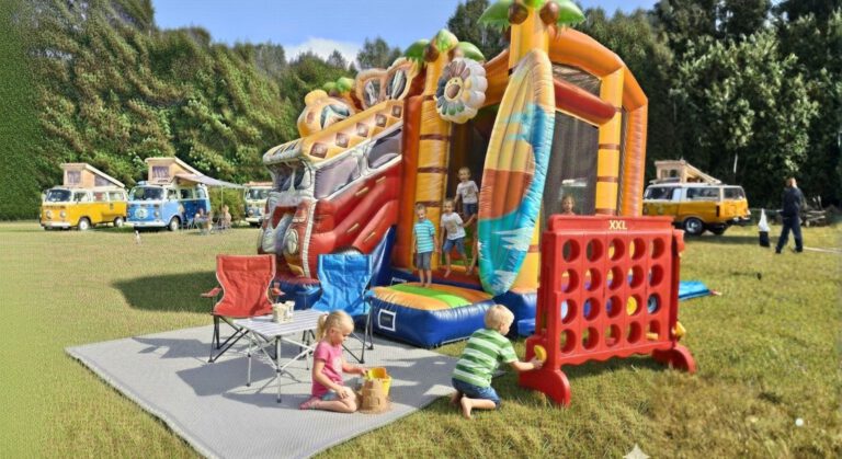 Unsere Bulli-Hüpfburg mit coolem Sommer-Flair ist was ganz besonderes für dein Camping-Event und wird mit unserer Komplettausstattung zu einem richtigen Feten-CAMP.