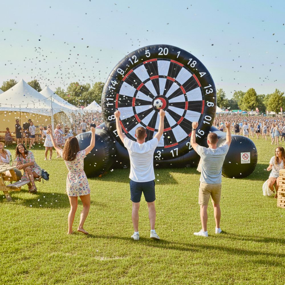 🎯 XXL-Fußball-Dart (3,50m): Der absolute Eyecatcher für euer Firmengelände. Weithin sichtbar und der perfekte Eisbrecher für den Einstieg ins Event.