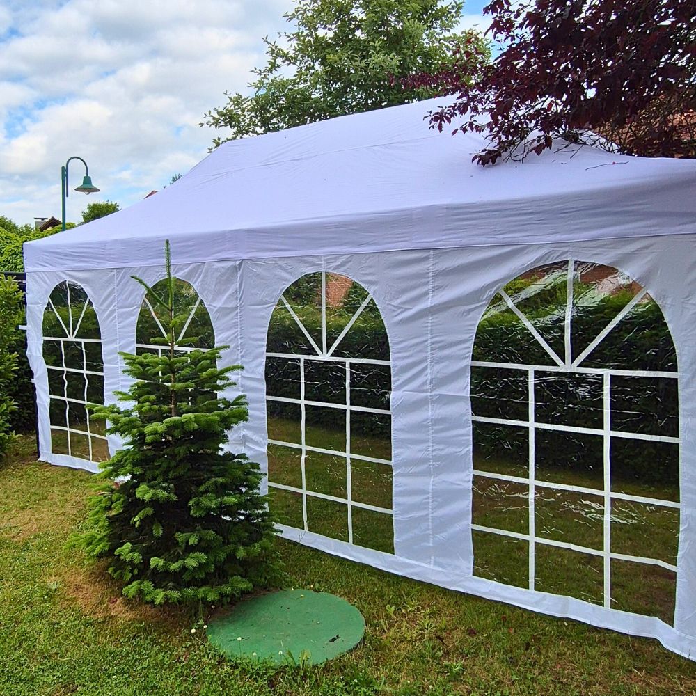 Miete dir unseren weißen 6x3m Faltpavillon mit vier Seitenwänden und Fenstern