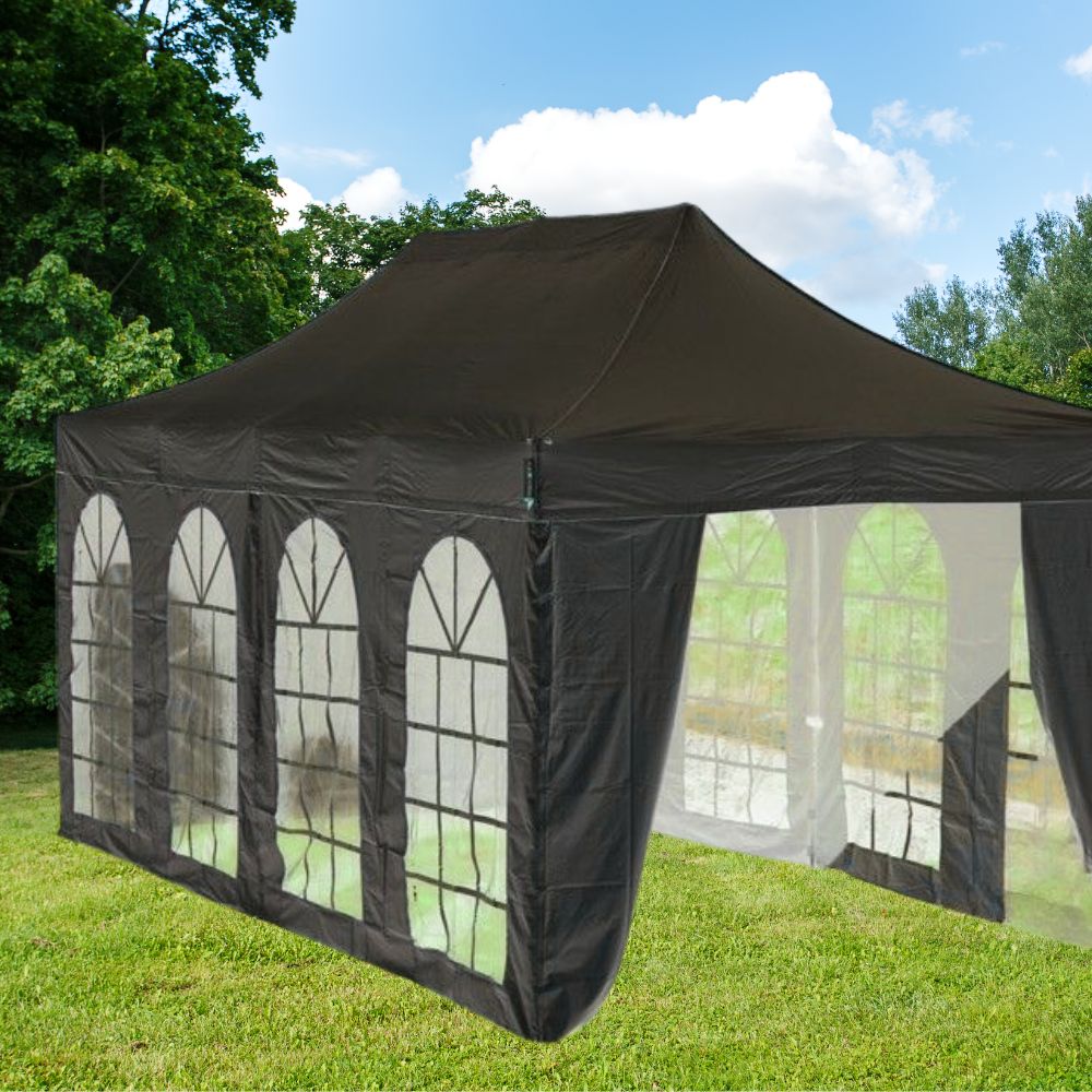 Miete dir unseren schwarzen 6x3m Faltpavillon mit vier Seitenwänden und Fenstern
